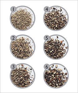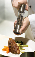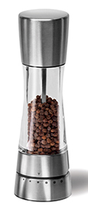 そして最大の特徴といえるのが、「素材をつぶすのではなく、カットする」ということ。ペッパーミルには硬化カーボンスチール製、ソルトミルには、ダイヤモンドシャープセラミック製という、それぞれの素材の特性に合わせた、永久保証付きの高品質かつ耐久性の高い刃を使用。ゆえにひと挽きで多くの量を挽くことができる。