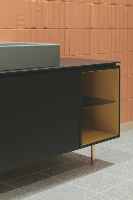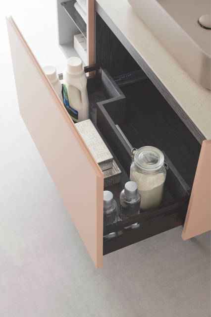 こだわりの水まわり空間を提案する「AQUAPiA」は、建築用陶磁器・タイル・水回りの衛生陶器の専門企業である平田タイルがプロデュースするブランドである。洗面キャビネットやインテリア性の高い洗面ボウルなど確かな品質と豊かな表現力の水回り製品が多数揃う。例えばオリジナルの洗面キャビネット『ASSEMBLAGE』はセミオーダー式で、キャビネット、カウンター、洗面ボウル、水栓金具の色や素材など細部に渡りセレクトできる。