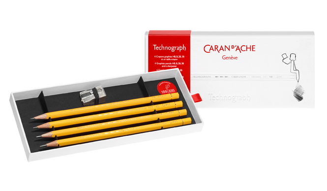 「テクノグラフ 100周年記念 4本セット」は、1920年代に誕生したカランダッシュの原点である鉛筆「テクノグラフ」の記念モデル。適切な管理がなされた森林の木材であることを示すFSC認証を受けた上質なシダーウッドを使用し、硬度は12種類のなかから、4種類(HB、B、2B、3B)をセレクト、鉛筆削りとセットになっている。