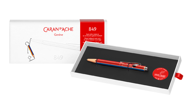 「849 100周年記念ボールペン」は、鉛筆のボディラインをヒントに誕生した1969年以降、数多くのデザイナーとのコラボレーションを発表してきた「849」の記念モデル。色鉛筆から着想を得たヴィンテージ風ファッションを身にまとい、ボン・ミンのキャラクターが描かれている。