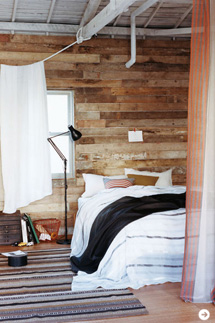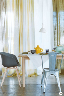 ファブリシア「トランス&ケースメント」は、光を通す薄手の生地5種13色を揃え、カーテンやベッドスプレッドとして一枚でさらりと使うことも、厚手の生地と組み合わせて使うことも可能。間仕切りのように空間を仕切るのにも効果的に利用できる。