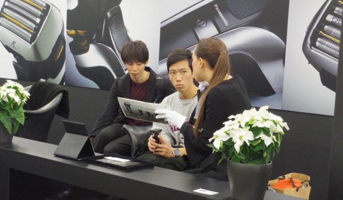 対照的に面白かったのが、電気シェーバー初体験という学生二人組だった。早速コメントを求めると、「初めて使ってみたのですが、こんなに簡単に隅々までしっかり髭を剃ってくれるのですね。それまで電気シェーバーは、ちょっと怖いという先入観があったのですが、このラムダッシュが見事に打ち消してくれました」との言葉をいただいた。その後も30代の男性が次々と5枚刃ラムダッシュを手に取り、何よりも予想外の優しい肌触りを絶賛していた。