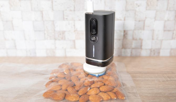 この「パキューム」の魅力はなんといってもコンパクトなサイズと使えるシーンの多さ。衣類はもちろん、湿気を防ぎたい乾物やお菓子、かさばる食品の空気を抜くなど、日常使いにも役立つ。空気を抜く時は、手を塞ぐことなく、自動で圧縮。他の作業をしながら作業できるのもうれしいポイント。