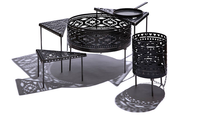“心地いいキャンプを、そして心地よく焚火を”をコンセプトに活動する「Sanzoku Mountain」に別注したネスティングテーブル。サイズが異なる3つの天板には、プリミティブな幾何学模様が施されている_が、こちらはニューメキシコ州チマヨの伝統工芸品でもある織物の柄(オルテガ柄)をモチーフにデザインされたもの。天板は火の通りやテーブルとしての安定性にも考慮され、映し出される影は美しく、キャンプシーンをより豊かにしてくれる。