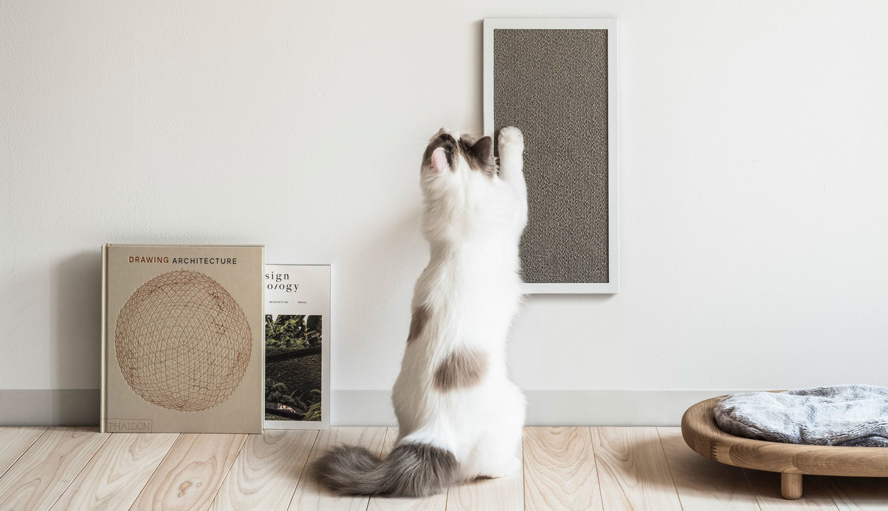 一般的な爪とぎはダンボール製で置き型が多いが、「NEKOBOARD」はカーペット生地を使用した壁掛けタイプ。インテリアのアクセントとしてお部屋に飾りながら、愛猫のマーキングを促すことができる。
