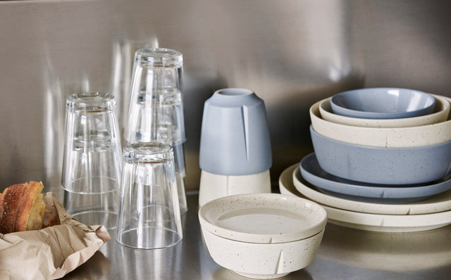 日本で発売となるのは、プレート、ボウル、カップ、マグカップ。プレートとボウルはスタッキングが可能となっており、収納スペースを効率的に使えるのはもちろん、プレートがボウルのカバーも兼用。