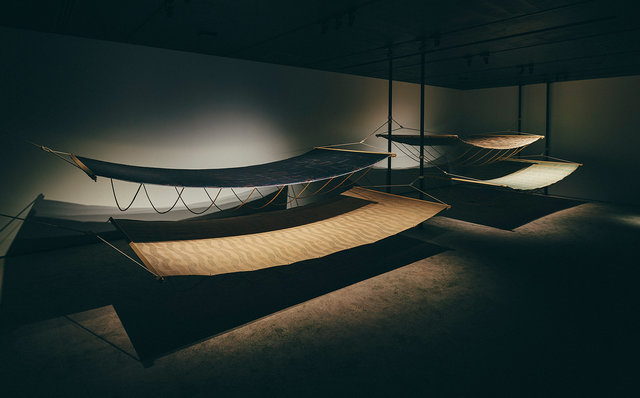 本展示では、協働の成果として新作のテキスタイル作品「SINUOUS」のインスタレーション展示をするとともに、コラボレーションにより制作したHOSOOの新作テキスタイルコレクションが一堂に会する。