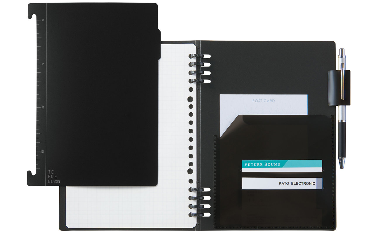 さらには打ち合わせ等で内容隠しにも使用できるブラインドシートも付属するなど、ビジネスシーンを想定して細部に至るまで配慮。サイズはA5、B5、スーツのポケットにも入るハンディサイズ(A5変形)の三種類を展開。