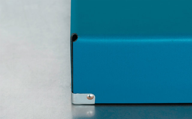 ヨーロッパで開発されたリサイクル可能な繊維ボード「パスコ」を折り曲げて形成し、四つ角を最小限の金物で留めたシンプルな構造だ。