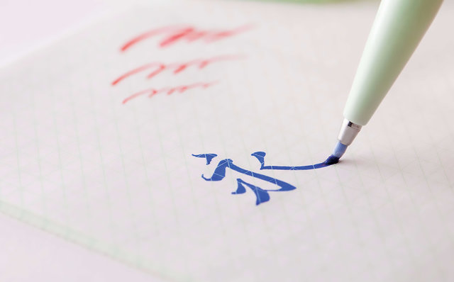 最大の特長は、適度にしなり、独特の柔らかな曲線を描けるペン先。このしなりを活かすと自然と描線にメリハリが加わり、トメ、ハネ、ハライが効いた味のある文字や線を描けるという。