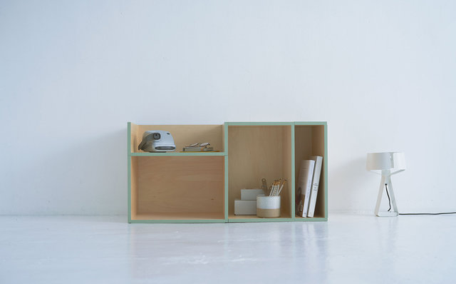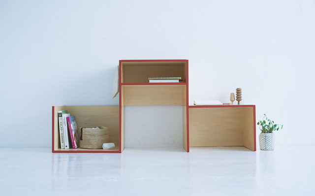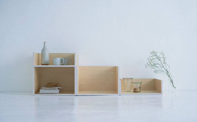 床に座ったときのローテーブルにしたり、棚な子供の勉強机、机の下の収納になったり、はたまなオブジェを置く台になったり、横置きでも縦置きでも裏返しても、大小の組み合わせでもよさそうだ。