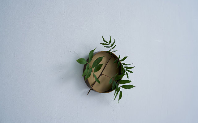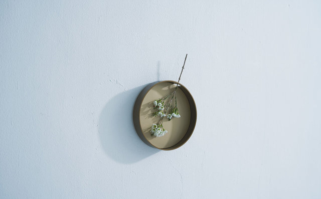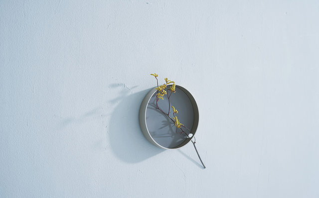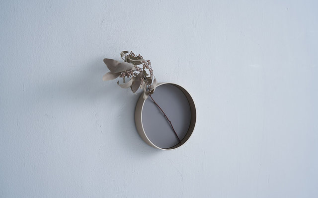 見立てた植物の角度を変え、様々な表情をつけることが可能。プレート裏面にはフックがあり、時計と同じように壁に掛けるか、もしくはテグスや紐を巻きつけ吊るすか、2 通りの飾り方がある。また、生ける植物は徐々にドライフラワーとなるため手入れも少なく、より気軽に楽しめる。