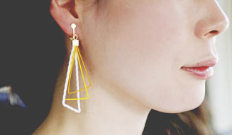 ハンドメイドアクセサリーに使用している水引は、紙をよった紙芯“こより”に細い糸が巻かれたもの。繊細で美しく、メタル素材では表現が難しい、紙素材ならではの軽さと発色が特徴だ。1本という線から生まれる緊張感により、凛とした確かな存在感をアピールする。