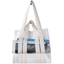 多機能トートバッグ「Multi Tote Bag」は、“普通のトートバッグふたつ分+中央にはさんで+テープのあいだに差し込んで”と、収納量や用途に合わせてさまざまな持ち運び方ができる。さらに中央をハサミでカットすれば、ふたつのトートバッグに切り離すことも可能となっている。