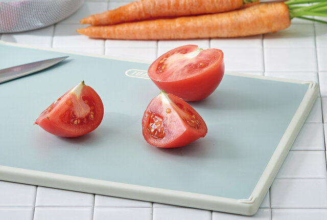 本体に細菌やカビの繁殖を防ぐ銀系抗菌剤(バクテキラー® )を入れることで、衛生的なまた板を目指した。外装にはシリーズで人気の「ペールアクア」色を採用し、程よい厚みをもたらしながら、その重量はわずか約330グラムと軽量な作り。両面とも四隅に滑り止め加工を施しているため、調理の際もズレにくく安心だ。