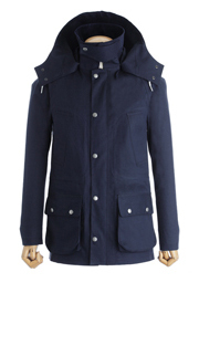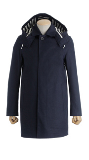 ベストセラーのDUNOONにデタッチャブルフードがついた新モデル。フードの内側と裏地に配されたストライプがマリンな雰囲気を醸し出す。フード付きでカジュアルに、フードをはずしてビジネスに、フレキシブルな着こなしが楽しめる。コットン100%ゴム引き。ネイビー。15万150円