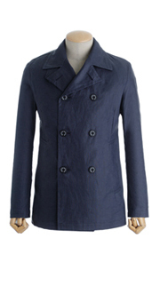 光沢が美しいPコートタイプのアウターは、ジャケット感覚で羽織れる便利な一着。リネンにポリウレタンコーティングをほどこし、撥水性を高めた新素材を使用してある。リネン100%。インクブルー。8万2950円