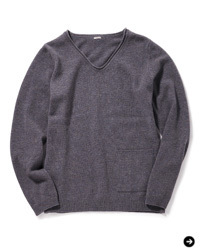 素肌に直接着ても心地よい、メリノウールのプルオーバーニットもお薦めのアイテム。小さめのVネックや袖口のロールをデザインのポイントにしつつ、サイドシームをなくすことで着ているときの違和感がまったくないのがうれしい。