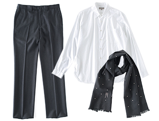 今季のマーガレット・ハウエルを象徴するのは、リラックスしたフィット感が斬新なモノトーンスタイル。なかでもすべての着こなしにおける基礎となる白のシャツは、季節ごとに買い足していきたいアイテムだ。こちらは滑らかなスイスコットン100パーセントで仕立て、着丈を長めにデザインした1枚。台襟が低く、襟先が短めなのが、このブランドならでは。すとんと縦に落ちるウールトラウザーズと同色の英国製ドットスカーフを合わせて、初秋らしくエアリーな着こなしを楽しみたい。