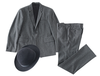 セットアップの着こなしにも注目したい。ボクシーなシルエットが映えるフォックスブラザーズ社のドッグトゥース生地で仕立てた2Bジャケットは、短めの丈でバランス良くデザインされている。セットアップで楽しめるトラウザーズは、腰回りのややゆったりとしたシルエットながらも、絶妙なテーパードラインを描き出す。ツバの広いフェルトハットを合わせて、英国らしいグレーの着こなしをアーティスト風に。