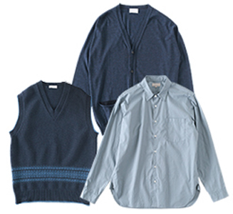おなじく英国老舗のフォックスブラザーズ社のペンシルストライプのセットアップは、トーンオントーンで着こなす。コレクションルックではシャツとの合わせで提案しているが、セットアップの温かみのある素材感をいかして、ニットをレイヤードするのもおすすめ。ニットベストはカシミア混のミドルゲージで、ニットカーディガンはジョンスメドレー別注品だ。
