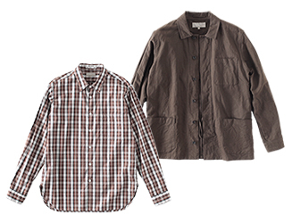アーシーな色の組み合わせの英国カントリースタイルを、モダンに昇華した秋らしいコーディネイト。そんな着こなしには、落ち着いたトーンのチェックシャツを差し込むのも面白い。今季のキーカラーであるブラウンと連動したオリジナルのコットン生地を使用し、着回しやすいややタイトなシルエットにまとめている。余計な装飾を施さず、ワーク由来の質実剛健な仕上がりに。