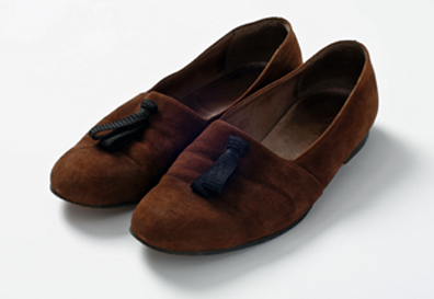 これは「バロール」でデザインものに挑戦した靴で、今でもかなり履いています。リゾートにはこれで、サファリジャケットにサロン(腰巻き)に裸足でこのスリッポンですね。不思議な靴で、必ず「どこの靴?」と聞かれますよ。ロンドンの王侯貴族のベロアのスリッパがモチーフです。インターナショナルギャラリーではパイソンの靴とかも作って、自分的には大満足なんですが、売れなかったですね(笑)。たまに売れるものもあるんですけどね。