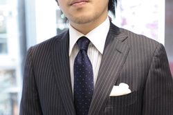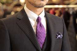「ベストをセットアップした英国伝統のスタイルを踏襲するスリーピースです。とくにこのモデルは今シーズンのアイコンスーツで、美しいサージの生地は扱いやすいスーパー100を採用。やや深めのVゾーンにはピンホールシャツをセレクトして、明るめのパープルのネクタイとともにフォーマル感を演出してみました」
