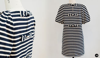 打ち出しているつもりはないんですけど、カットソーの背中にリボンがついているイメージが強いみたいで、それになっちゃうのかな? いま、リボンは流行ってるし、個人的にも好きだけど、とくにそれに固執してるわけではないんです。ただバイヤーさんからの支持も高いアイテムだし、リボン付きカットソーは毎シーズン色ちがいでつづけてます。でもいつまで人気があるのか不安なので、毎回バイヤーさんに聞くんですよ、「まだイケますか?」って(笑)。買い付けてもらえるうちは、定番的な扱いでつづけると思います(笑)。
