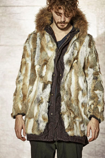 ムラ染めの特殊加工をしたモッズコートにラビットファーのライナーをセット。あえてライナー側を表に着るミリタリーアイテムとゴージャスなファーをミックスさせることで、サージュデクレらしさを残しつつエッジの効いたスタイリングを提案しています。