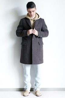 キーアイテムはコート。2種類の異なる糸を編みたてた生地を縮絨(しゅくじゅう)し、さらに芯地を貼り合わせることで独特のハリ感とニットの柔らかさが混在しています。縮絨されているので、裁ち落とし仕様にしたり、縦にスッと落ちたシルエットが気に入っています。色では、ネイビーとグレーが定番カラーなのですが、今シーズンは茶系やインナーで着る差し色のオレンジが新鮮に感じます。
