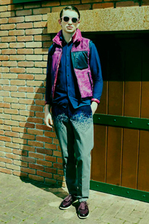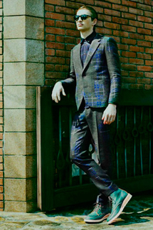 キールックは、着こなしだけを見ると、セットアップにインナーダウンを合わせ、キャップとクラッチバッグにスニーカーという都会に馴染むコーディネイト(下右)ですが、アイテムごとに見ていくと、セットアップはブランケット柄のチェックが部分的にあらわれていて、インナーダウンに見えるベストは中綿の代わりのフェイクファーをオーガンジーでくるみファーが透けて見えます。キャップにはルックの角度からは見えませんが、都市の名前が刺繍されていて、糸が途中からフリンジへと変化しています。スニーカーに見える靴はスニーカーのメッシュやハトメ、ステッチといった柄をレーザー加工で表現しているレザーシューズになっています。普通に見え、見た人に何か違和感を感じ取ってもらえればとコーディネイトしました。