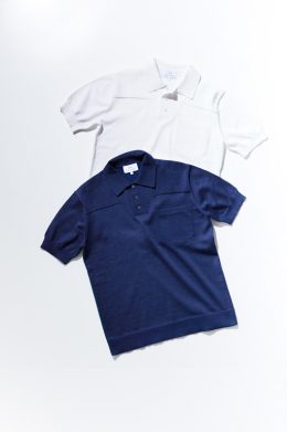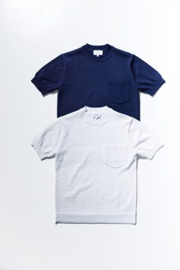 よりニットらしい表情がポイントでTシャツよりもぐっと洗練された雰囲気のクルーネックニットTシャツと、肩のヨークの切り替えを編み続きのミラノリブで編み立て、凹凸のある浮き出たような表情が印象的なニットポロの2型で展開する。