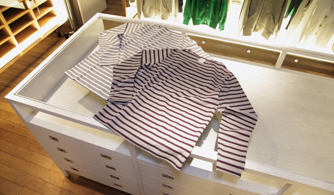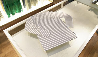 鈴木 こういう天竺編みのカットソーだと、セントジェームスみたいな、ゴワッとした厚めのドライ感があるものが多いですよね。いわゆる「バスクシャツ」というアイテムには、やわらかい風合いのものは、なかなかない。糸を太くすると生地は基本的に固くなるんですけど、吊り編み機を使うことでやわらかく仕上がりました。