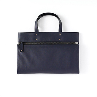 ネイビーのクラッチは縦長のバッグを折畳み、ビッグファスナーで留めたもの。そのため、荷物の容量によって姿を変えることも可能。素材はしなやかなレザーでネイビーの発色も良く、バッグ内部は落ち着きのあるボルドーカラーとなっている。