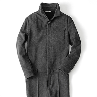 ヘリンボーンのジャンプスーツは、背面にヨークを取り入れたシャツライクな上半身に、ボトムス部分はベルトループ位置で切り替えを入れた、同素材ながらもメリハリのあるデザイン。クリースはステッチで縫われており、それがドレス感を引き出している。