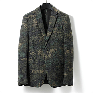 ピッチの広いクラシカルなヘリンボーンに、カモフラージュ柄をあしらったジャケット。ショルダーのつくりは構築的なもので、男性的なシルエットを強調。ラペル裏や前身ごろにはグレーのスーツ地をあしらっているのも、ユニークなディテールといえる。
