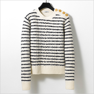 前身頃とアームに編み目の詰まったウールを使い、ふわりとした心地よさとボリューミーなハリを両立したニットは、ショルダーのメタルボタンが特徴的。背面には帆船を編み地に取り入れて、都会で着こなす大人のマリンアイテムとしておすすめしたい。
