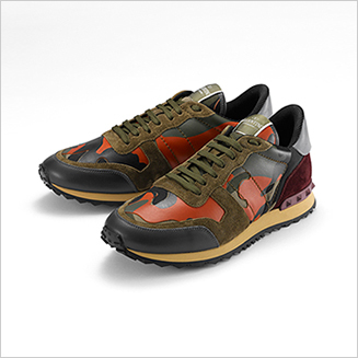 13SSコレクションでデビューを果たして以来、ベストセラーを続ける人気スニーカーの「ロックランナー」。限定発売となるモデルは、オレンジとブラックのカモフラージュ柄を取り入れたもので、アウトソールはピラミッド型のスタッズをモチーフにしたデザインとなっている。