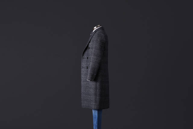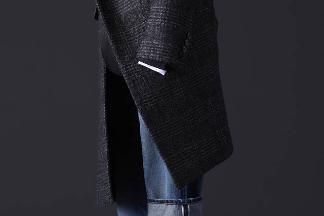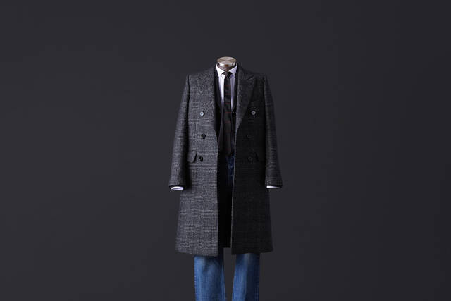 織りストライプの3Bジャケットにピークドラペルのチェックコートを羽織ったスタイルには、ほどよくブリーチされたジーンズをコーディネート。パリジャン・シックを彷彿とさせる粋なスタイリング。