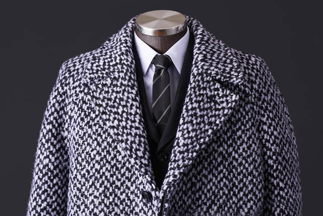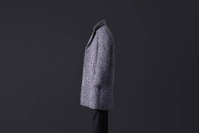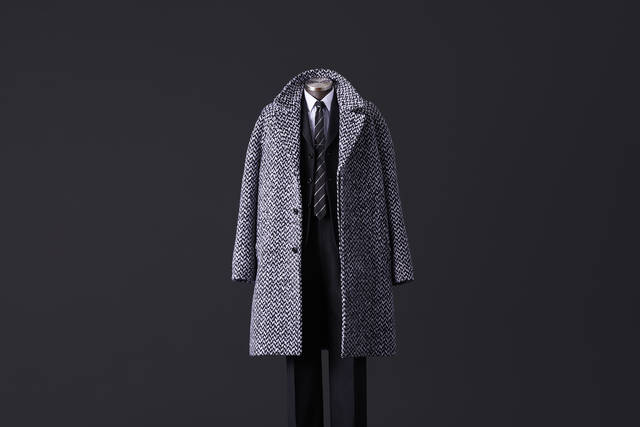 ざっくりしたツイードのマックコートはラグランスリーブ仕立て。織りストライプの3Bジャケットとパンツのセットアップに羽織っても崩れない完璧なシルエットは、綿密な計算の為せる技。
