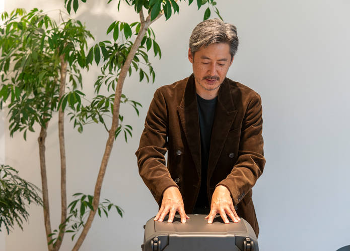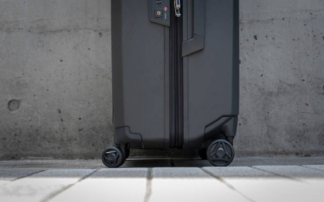 「ハンドルを伸ばして引っ張ったとき、グラつかないのがいいですね。ウィールがしっかり地面を捉えて、スムーズに移動できます。こうしたディテールの作り込みも、物欲をそそりますね。スーリー社独自の耐久性テストを経て、厳しくチェックされているから、ボディの堅牢性も高いのですね。僕の場合、一回の海外出張で約10日間ぶんの衣類を持ち運びますので、特に冬は相当な量になってしまうのですが、このサイズ感なら大丈夫そう。これからの出張に、Revolveを使うのが今から楽しみです」