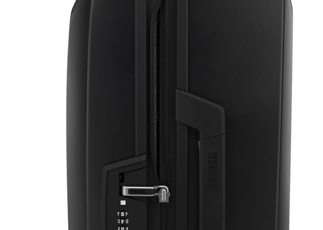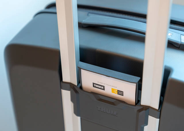 左:伸縮するハンドルの収納部付近には、スライド式のIDホルダーを備えている。右:前後のコンパートメントをつなげるジッパーには、破損しにくいジッパーを採用。2つのジッパースライダーの先端を差し込んで固定する。国際規格であるTSAロックを装備。