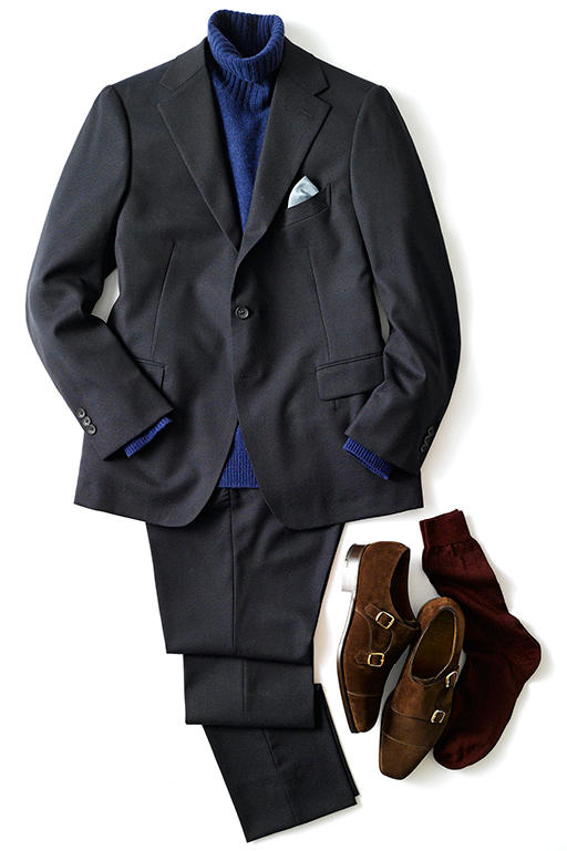 タートルネックをさらりと合わせ、ネイビーのトーンでまとめたジャケットスタイルは、シンプルながらも秋冬らしい素材感でまとめている。「起毛感のあるダブルモンクはオンオフ使えるアイテム。ボルドーのソックスをちら見せして遊びココロを加えています」(大野氏)