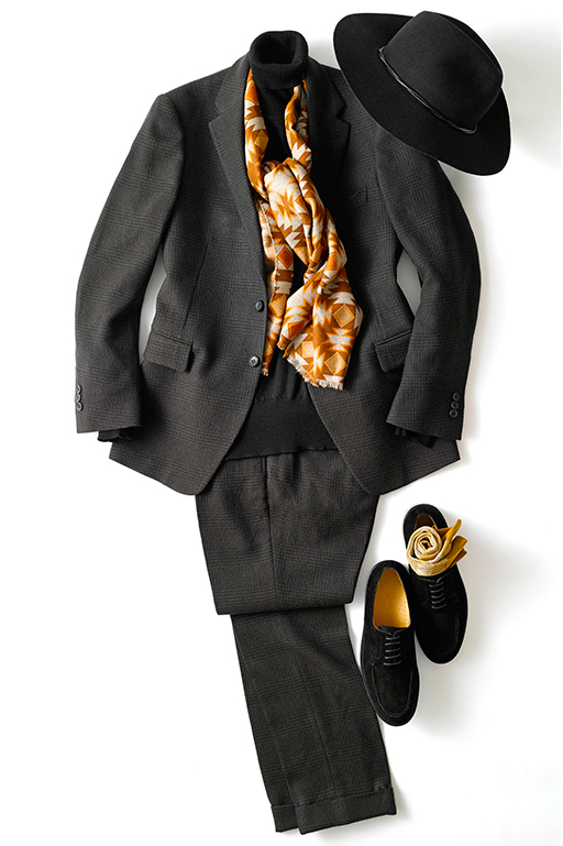 今季らしいブラウンとブラックの組み合わせが新鮮な印象に。「松下さんのつくるブラウンのグレンチェックは、まんまカントリーではなく、都市の中の公園くらいが似合いそう。黒のスウェードシューズやハットで、東京っぽさを残しました」。インナーはタートルネックのニット。(山下氏)