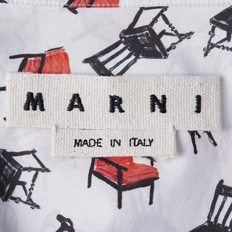 様々なデザインのチェアがプリントされたシャツは、ランダムな赤糸のステッチがアーティスティックなアクセントに。始末し忘れたかのようにあえて垂らした糸が、遊び心を感じさせる粋なディテール。