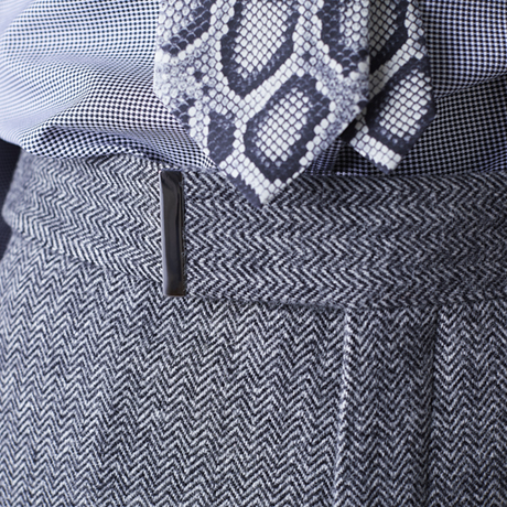 上質なヘリンボーンで端正に仕立てられたスーツは、ピークドラペルのシングルブレスト。広めの襟幅、ウエストベルトの金具、クラシカルな本切羽の仕様など、ブランドのDNAを感じさせるアイコニックなディテールも満載。