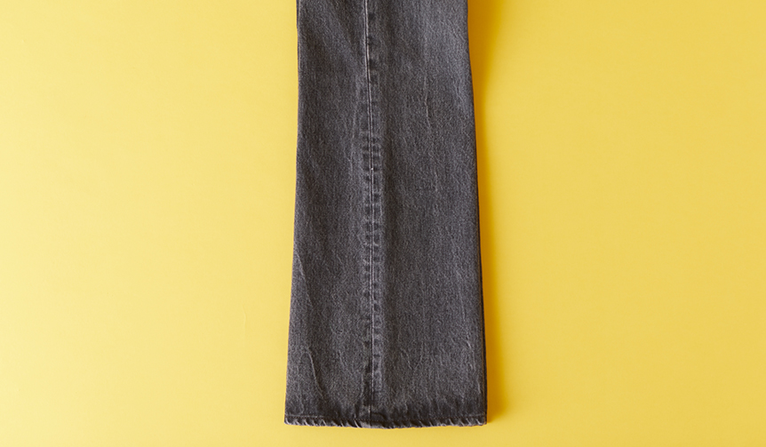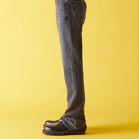 ほどよいヴィンテージ・テイストのこなれた風合いが加わった5ポケットのブラックデニムのパンツは、膝から裾にかけてのフレアシルエットに加え、裾のたまり具合も絶妙な一本。丸みのある……