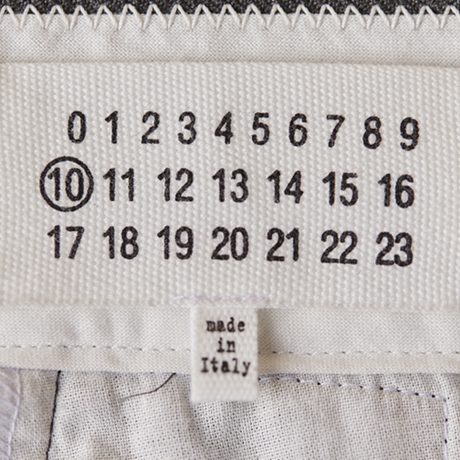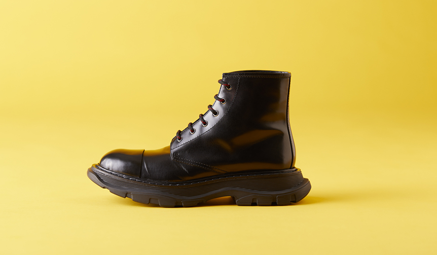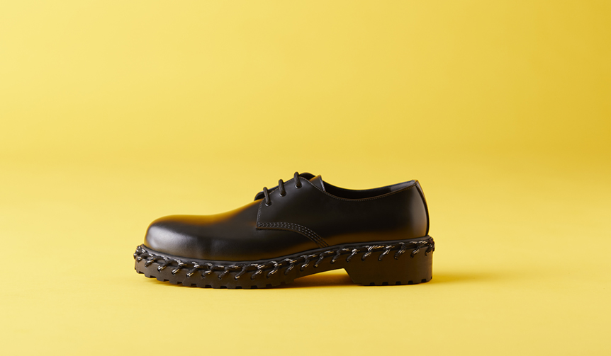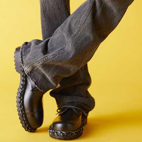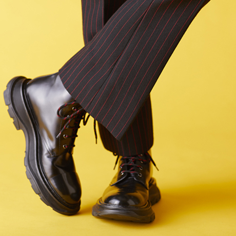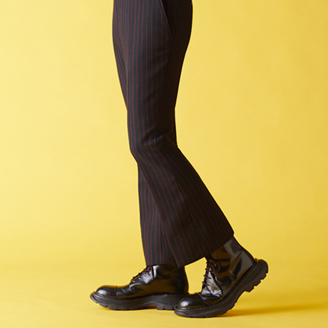 赤のストライプパンツの膝後ろにダーツを入れ、独自のシルエットを構築。足元にはボックスカーフのレースアップブーツをスタイリング。ボリューミーなトレッドソールが特徴的で……
