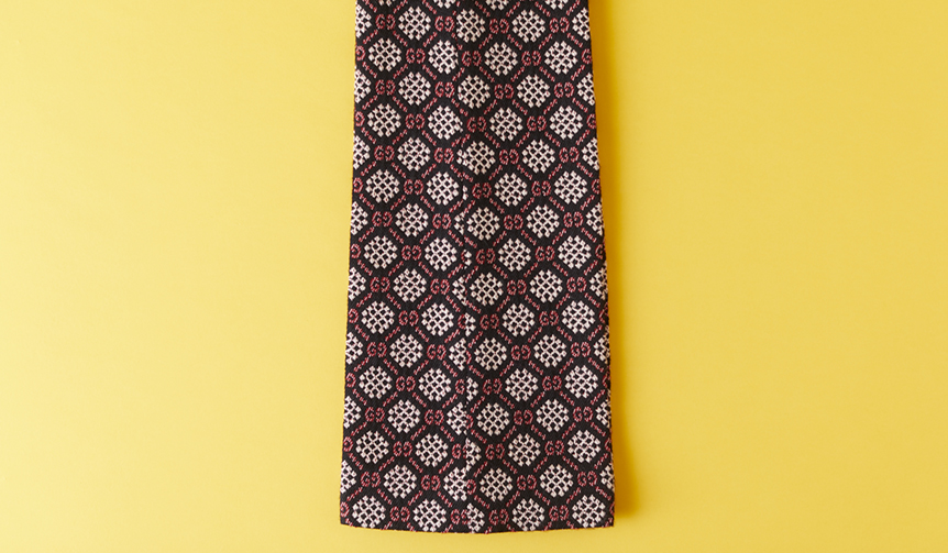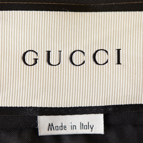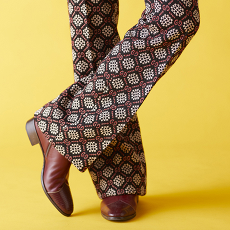 ヴィンテージ調のGGパターンがインパクト満点のフレアパンツ。ジャカード織で生地にハリがあるので、穿いたときのシルエットがシャープなのも特徴的。ブーツはトゥと履き口に……